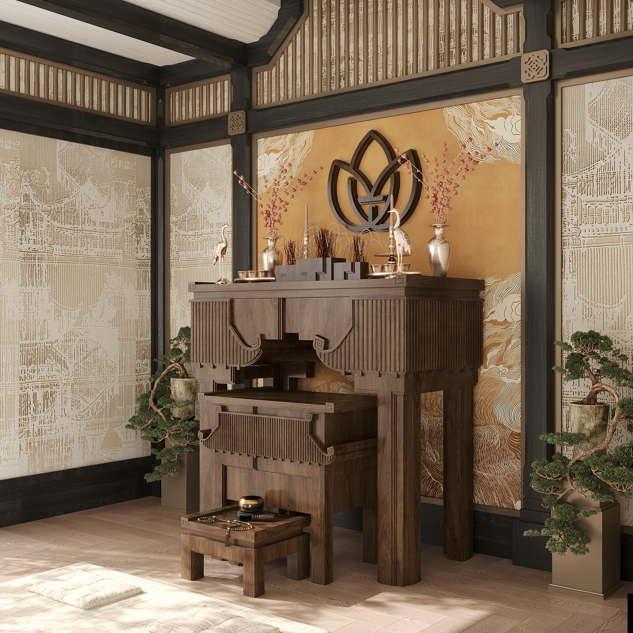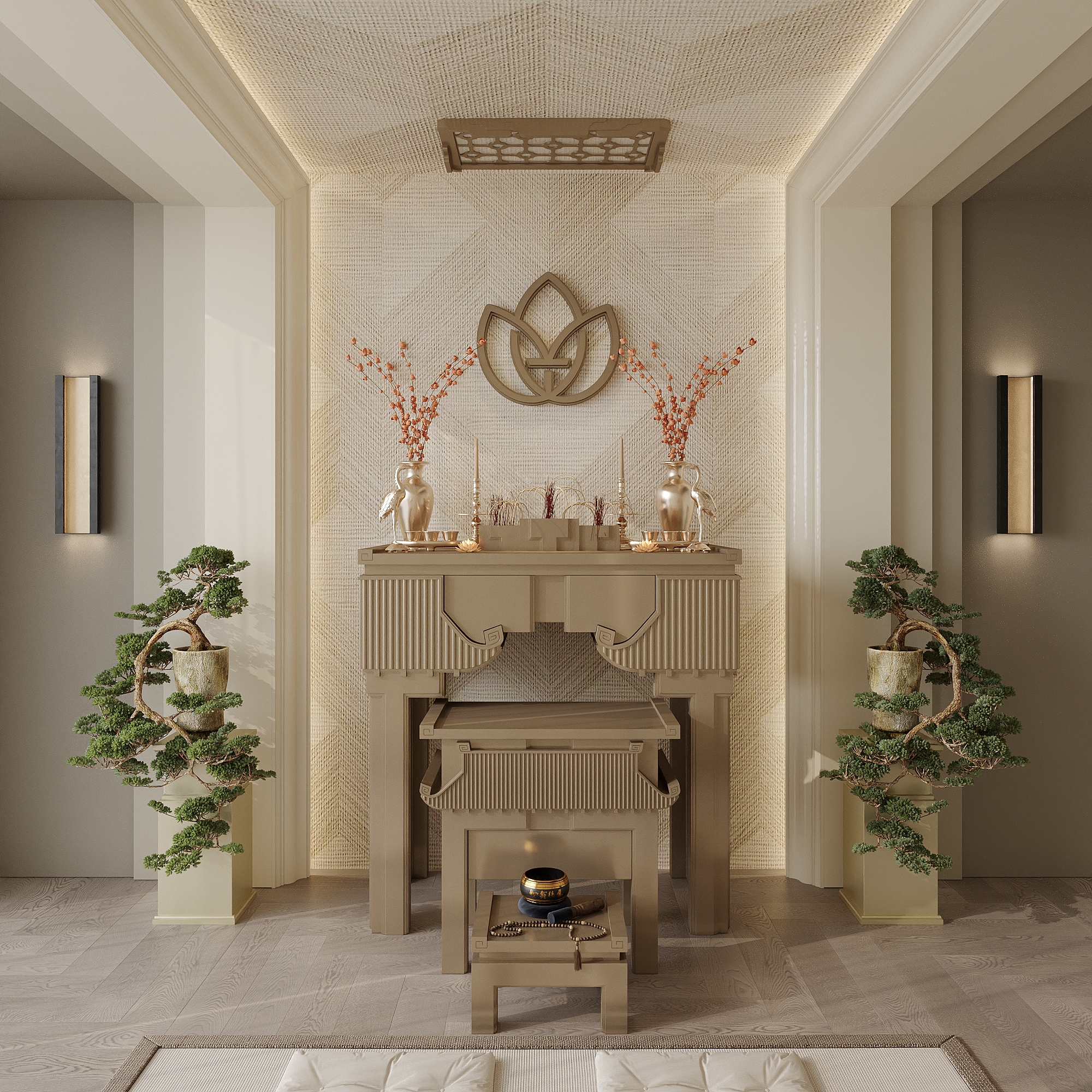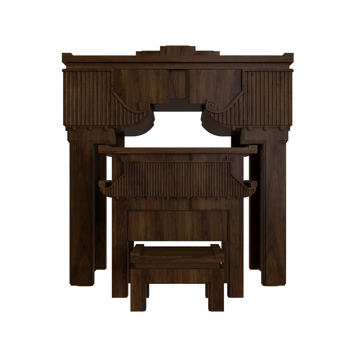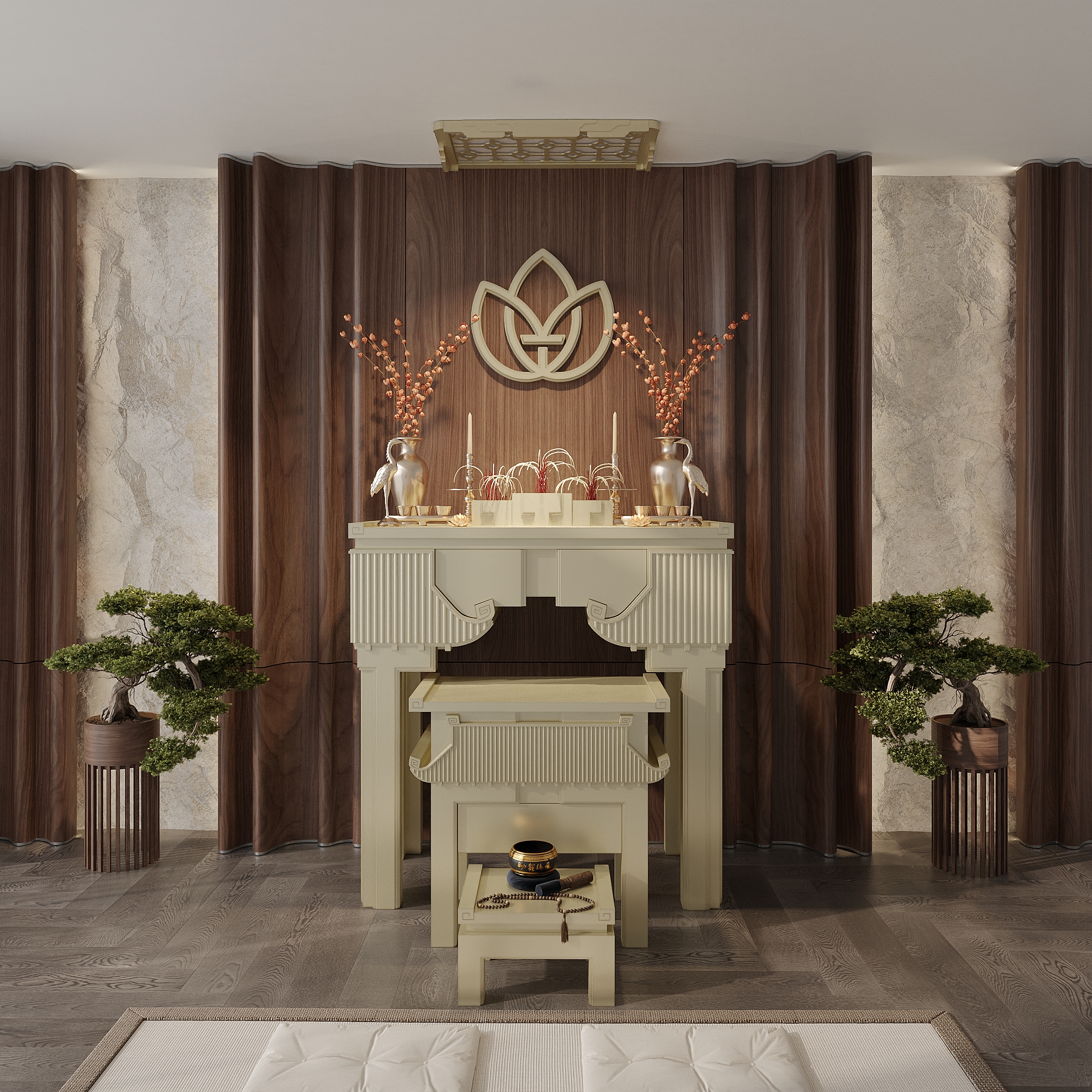 – Bàn thờ gia tiên được thiết kế với hình dáng hiện đại, kết hợp giữa các đường nét tinh tế và hoa văn truyền thống, tạo nên một tác phẩm nghệ thuật độc đáo, mang đậm bản sắc văn hóa Việt Nam.