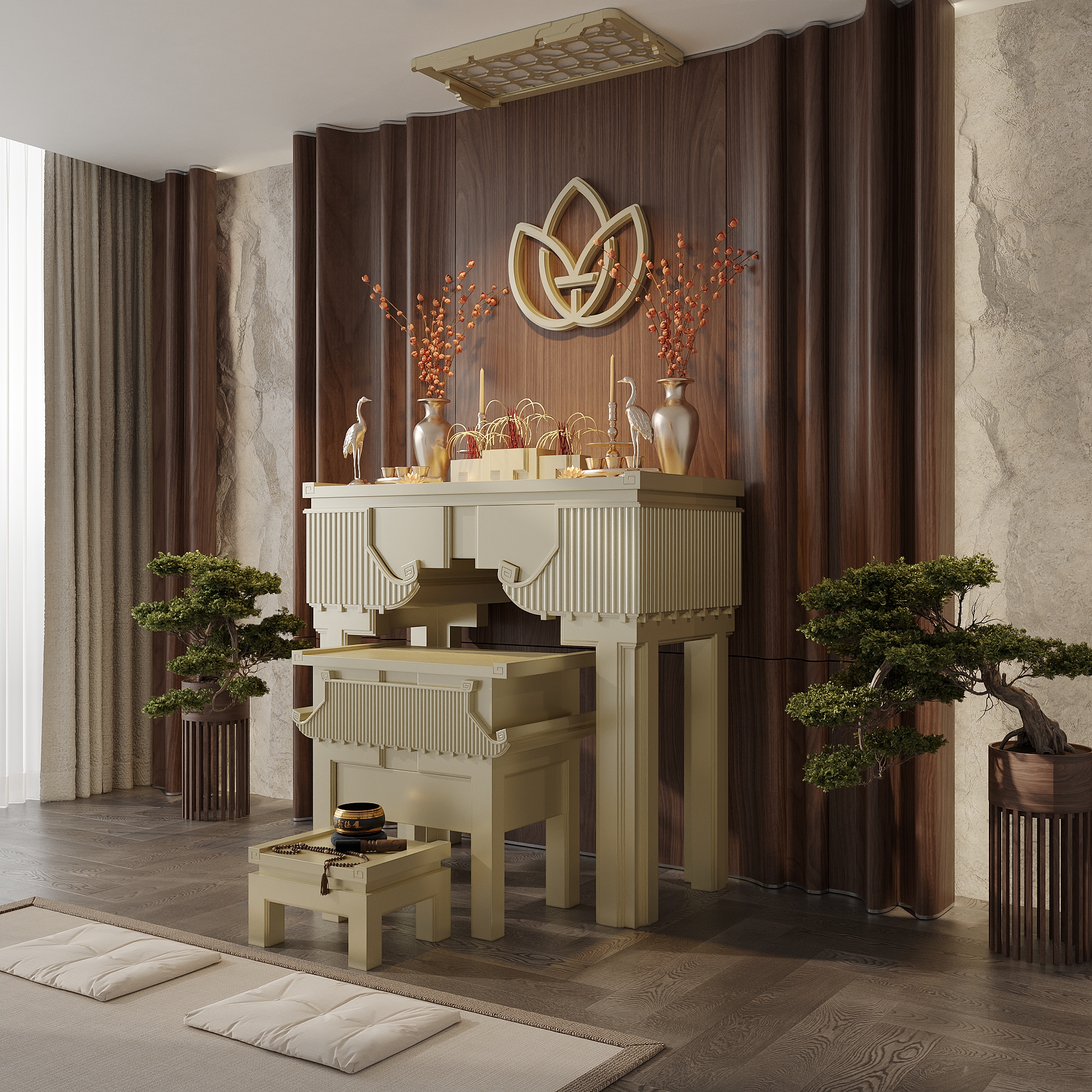 – Thoát khỏi những thiết kế bàn thờ gia tiên thông thường. Bàn thờ Mãn Đường của Dànam – nơi trung tâm thờ tự khởi nguồn mọi hạnh phúc, sung túc. Mang linh lượng Khang Ninh với thiết kế uyển chuyển, hình ảnh mái nhà cổ truyền thống giúp ổn định vận khí tài lộc cho gia chủ.