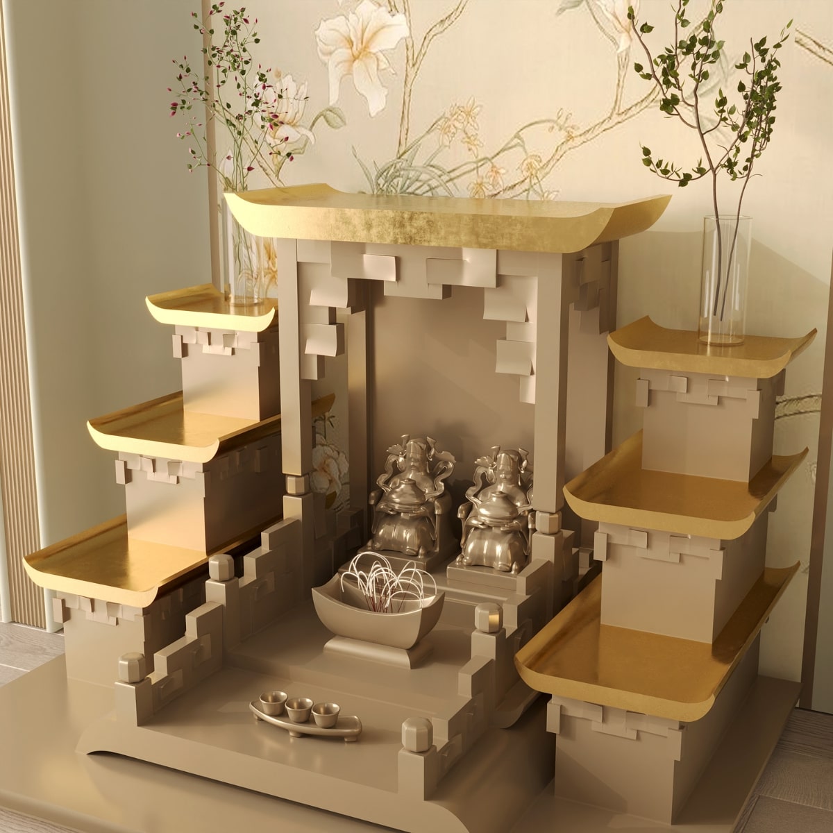 Bàn thờ dát vàng Dànam vượt ra ngoài những thiết kế bàn thờ thần tài thông thường, mang đến một không gian thờ cúng thanh tịnh và trang nghiêm. Với cảm hứng từ cổng trời, bàn thờ tượng trưng cho sự an yên và bình an trong cuộc sống. Thiết kế hình khối ba chiều, uốn lượn như mái chùa cổ, không chỉ thể hiện sự tinh tế mà còn mang lại cảm giác vững chãi, bền bỉ. Bát nhang được cách điệu giống như một thỏi vàng, giúp thu hút vận khí tài lộc cho gia chủ, trong khi bậc thang tượng trưng cho sự thăng hoa tinh thần, khẳng định giá trị tâm linh sâu sắc. Đặc biệt, bàn thờ dát vàng tam cấp Thiên An mang linh lượng “Đại Cát”, đem lại may mắn và sự thịnh vượng cho gia đình.