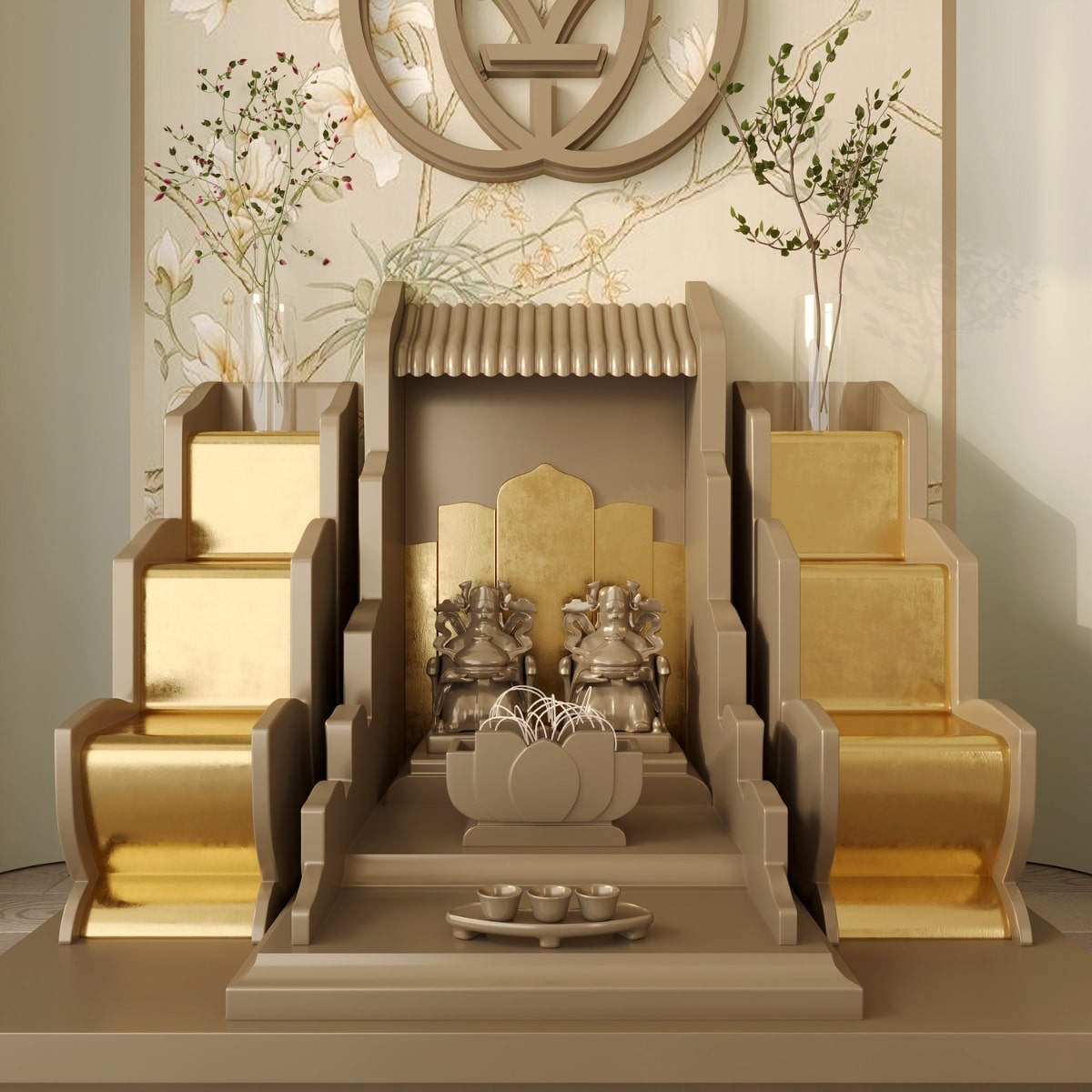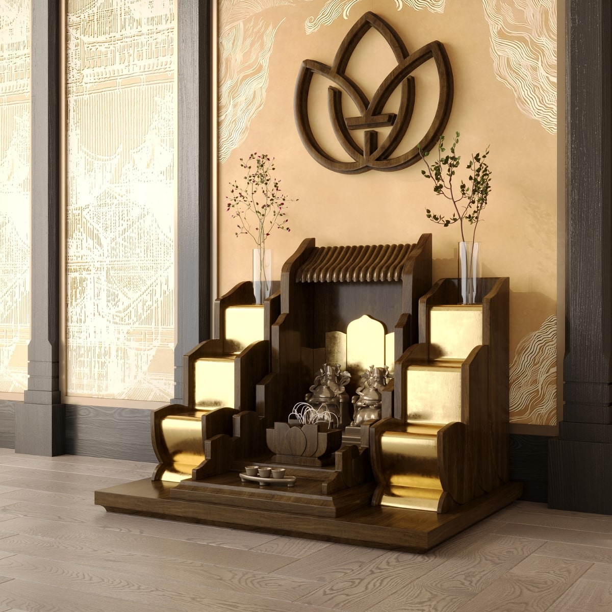 Bàn thờ dát vàng được thiết kế độc đáo, vượt ra khỏi những hình thức truyền thống, mang đậm dấu ấn văn hóa phương Đông với cảm hứng từ hai biểu tượng thiêng liêng: hoa sen và chữ Vạn. Bàn thờ Dànam thiết kế tinh tế, phù hợp với nhu cầu thẩm mỹ và tâm linh của người Việt, không chỉ tạo nên không gian trang trọng mà còn thu hút vận khí tài lộc cho gia chủ. Đặc biệt, bát nhang được cách điệu giống như một thỏi vàng, góp phần mang lại may mắn và thịnh vượng cho gia đình.